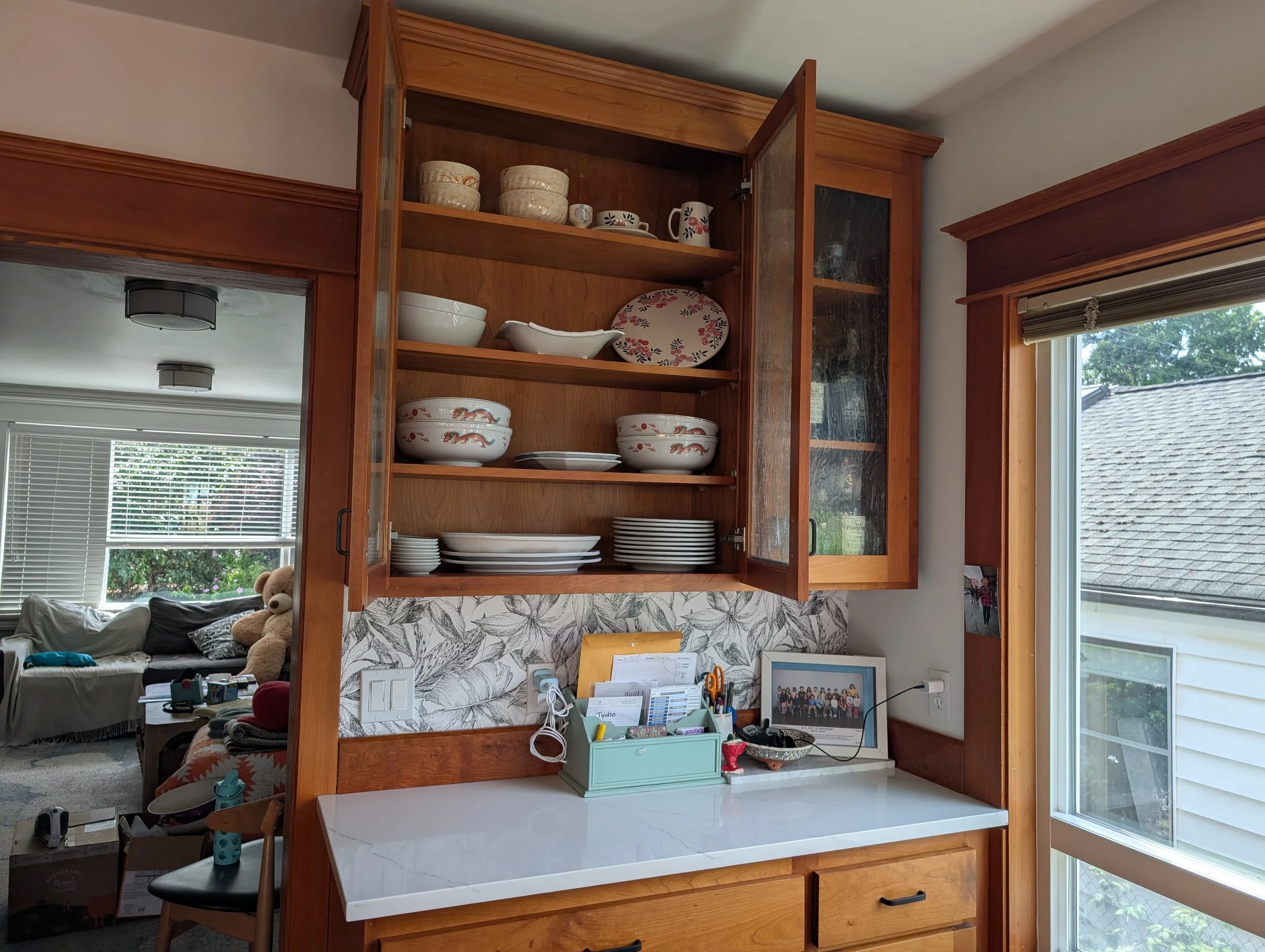 Streamlined cooking station: everyday dishes placed in the “triangle zone” between stove, sink, and dishwasher; seasonal serving pieces shifted to the dining room.